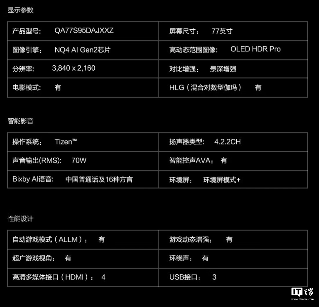 IT之家附现金三星 77 英寸 S95D 电视规格信息如下: