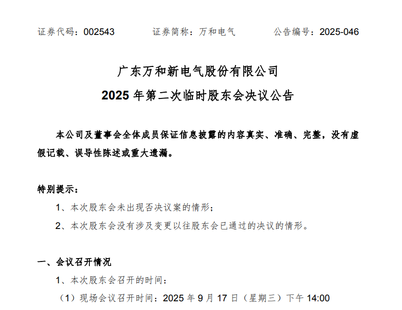 乐居财经 李兰 9月17日晚间,万和电气(002543.SZ)发布2025年第二次临时鼓舞会方案公告,审议并通过了选举赖育文为公司第六届董事会非孤独董事的议案。