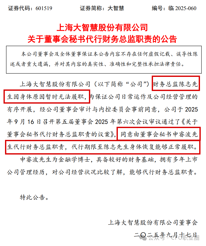 2025年9月17日,上交所主板上市公司大贤人(601519.SH)发布了《对于董事会通知代行财务总监职责的公告》。公告袒露,财务总监陈志先生因体格原因暂时无法履职,为保证公司日常运作及公司计较处置的有序开展,经公司董事会审计与内控委员会预先容许开云体育,公司于2025年9月16日召开第五届董事会2025年第六次会议审议通过了《对于董事会通知代行财务总监职责的议案》,容许由董事会通知申睿波先生代行财务总监职责,代行期限至陈志先生体格规复或者普通履职。