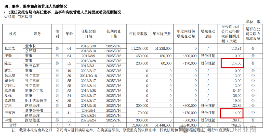 2024年度,陈志和申睿波的薪酬均为114万元。